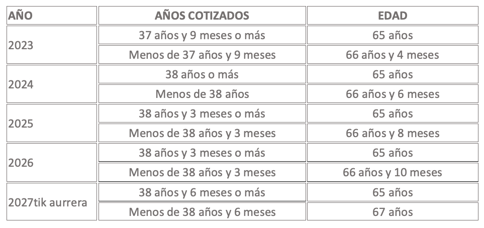 Como acabamos de mencionar, en 2011 se atrasó la edad de jubilación y se alargaron los años que había que tener cotizados. Esto se sigue aplicando progresivamente desde entonces y hasta 2027, como podéis ver en la tabla que hay más adelante.
