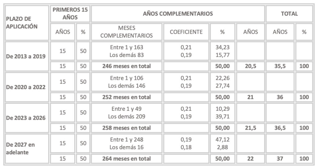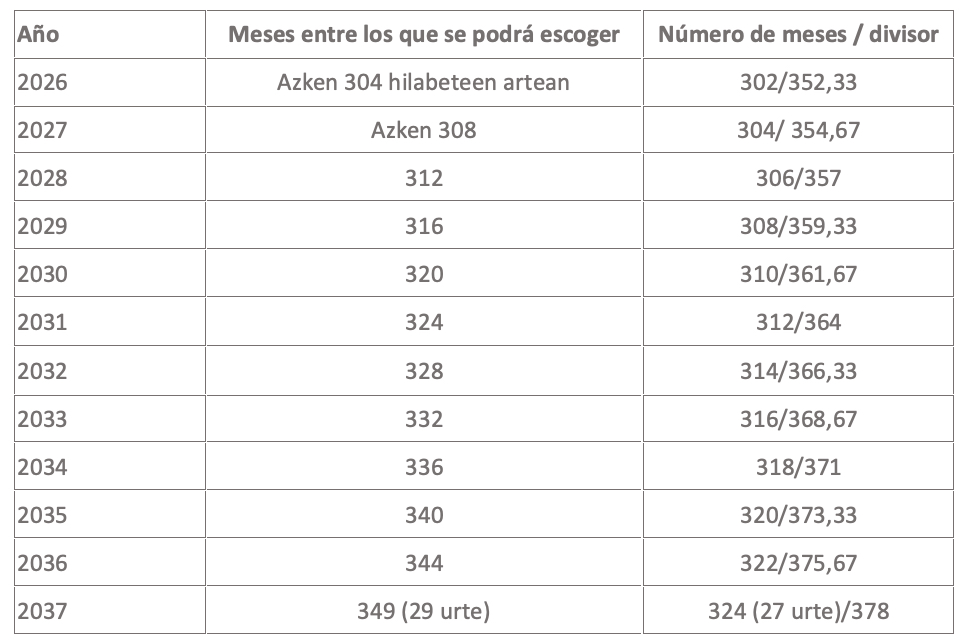 A partir de 2037, se realizará una sola operación: se tendrán en cuenta 324 meses para el cálculo (que se escogerán de entre los últimos 349 meses) y el divisor que se les aplique será 378.