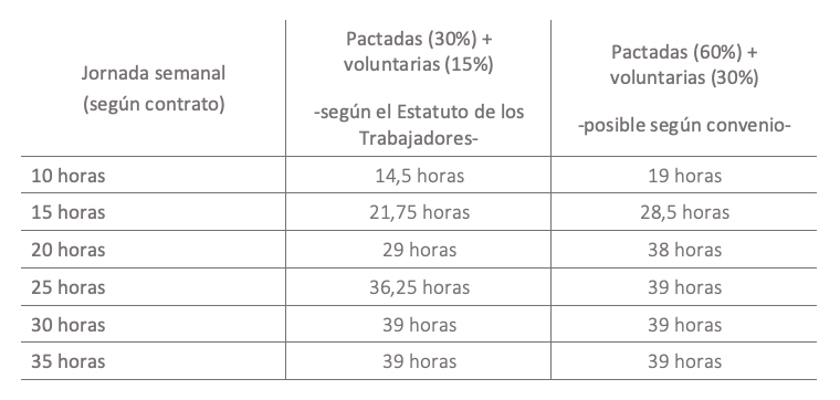 Por otro lado, las voluntarias, según el Estatuto, pueden llegar al 15%: 1,5 horas más, por tanto. Pero si el convenio lo aumentase hasta el 30%, supondría 3 horas más.