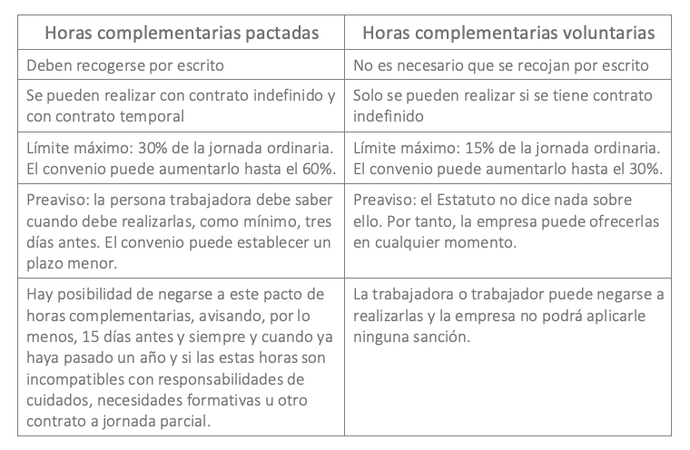 Como se explica en el artículo sobre las horas extra, diversos colectivos están exentos de realizar horas extra. Uno de ellos son las personas a jornada parcial. Pero ¿alguien creía que la patronal iba a renunciar a este caramelito, a contratar a la gente a jornada parcial y obligar a alargar dicha jornada según su interés o conveniencia? Pues no. Y para eso tienen las horas complementarias.
