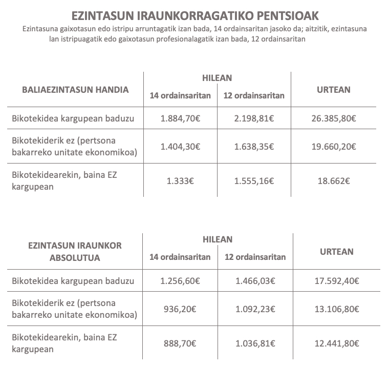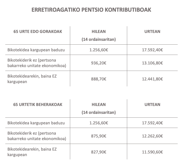 Pobreziaren muga: Azken pentsio erreforman ezarri zenez, 2027. urterako gutxieneko pentsio kontributiboak ezin izango dira pobrezia mugaren azpitik egon. Ez da gauza bera esaten pentsio ez kontributiboetarako, hala ere. Azken hauentzat formula ezberdina aplikatzen da: norbanakoari legokiokeen pobrezia muga bider 0,75. Bestela esanda, asmoa da pobreziaren mugaren %75ean kokatzea, hau da, askoz azpitik. (Gizarte Segurantzaren Lege Orokorraren 53. Xedapen Gehigarria).